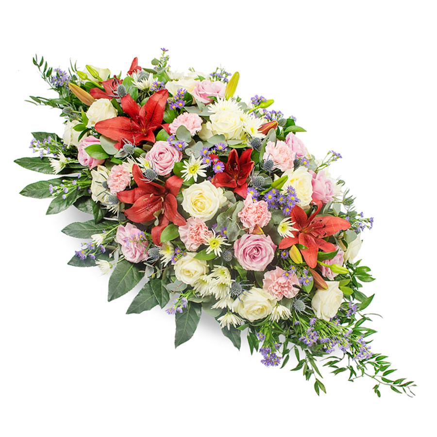 Express your peace and sympathy with our unique and stunning casket spray. This arrangement features a vibrant combination of pink and white roses, elegant lilies, and beautiful chrysanthemums, all complemented by fresh, lush greenery.