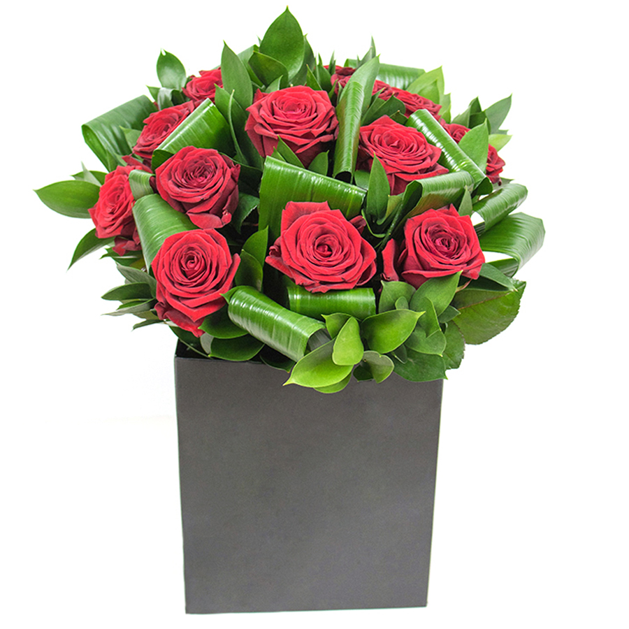 Experience a captivating display of vibrant red roses complemented by lush aspidistra leaves and delicate ruscus. This stunning bouquet is designed to elevate any space with its luxurious appeal and timeless elegance.