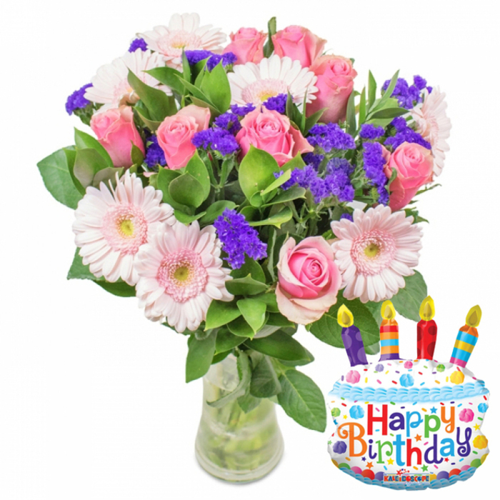 Send your very best birthday wishes with the most joyful combination of flowers and balloon. This selection of roses, germinis and statice flowers is creating a lovely floral display that will certainly brighten their special day and make it a one to always remember!