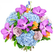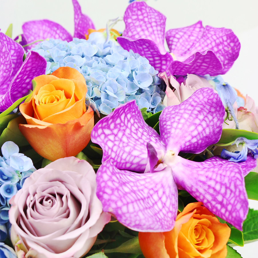 Embrace the vibrant beauty and unique charm of our meticulously crafted flower arrangement. Featuring a harmonious blend of fiery orange roses and serene blue hydrangeas, this bouquet radiates the joy and warmth of a summer evening.